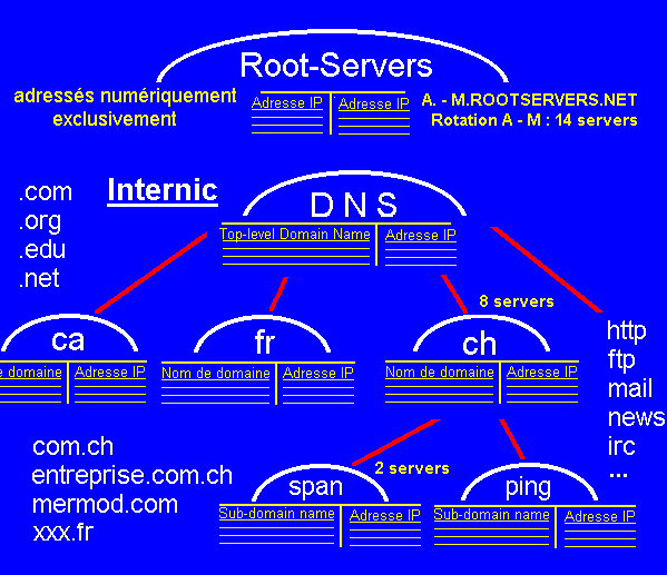 - chaque serveur peut utiliser plusieurs protocoles - on a le droit de faire précéder un nom de domaine d'autant de préfixes séparés par des points que l'on veut - au cours de déménagements successifs, il se peut très bien qu'un nom de domaine.fr soit dans la table d'un ISP de Genève Quand on effectue un déménagement : - la demande est adressée à l'ISP qui la transmet à Internic - Internic modifie la table de correspondance - l'ISP efface le domaine dont il n'a plus le domicile - pour trouver un document, les clients doivent remonter donc aussi haut que nécessaire, et on peut se représenter les tabels des ISP comme des caches, et fonctionnant comme tels. Cliquer dans l'image pour la discussion de la description analytique